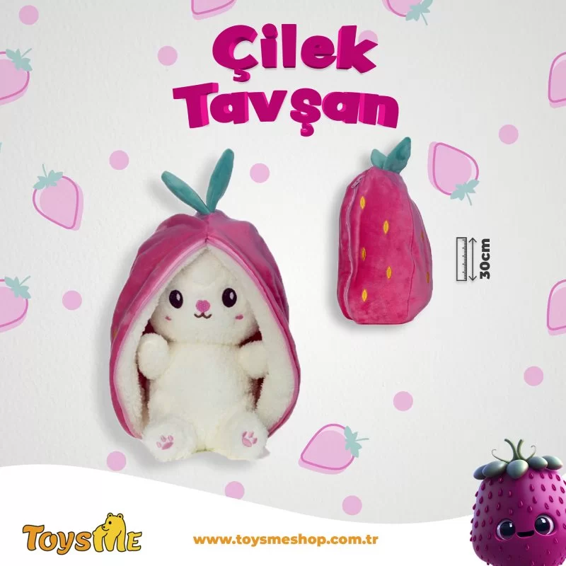 Bu sevimli peluş tavşan oyuncak, çilek kostümüyle çocukların ve peluş severlerin kalbini fethedecek!